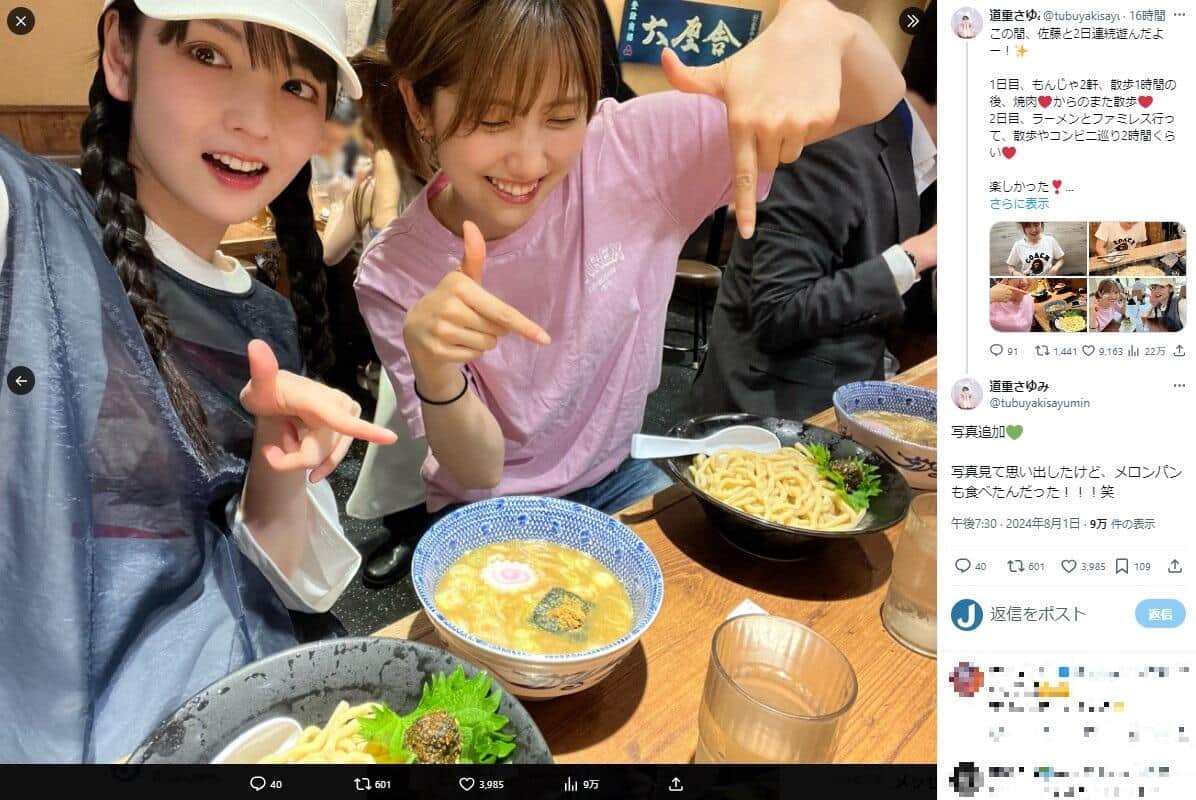 道重さんは1日にXで「この間、佐藤と2日連続遊んだよー!」と報告した。具体的なスケジュールを「1日目、もんじゃ2軒、散歩1時間の後、焼肉からのまた散歩 2日目、ラーメンとファミレス行って、散歩やコンビニ巡り2時間くらい」などと説明し、実際のツーショットも披露している。