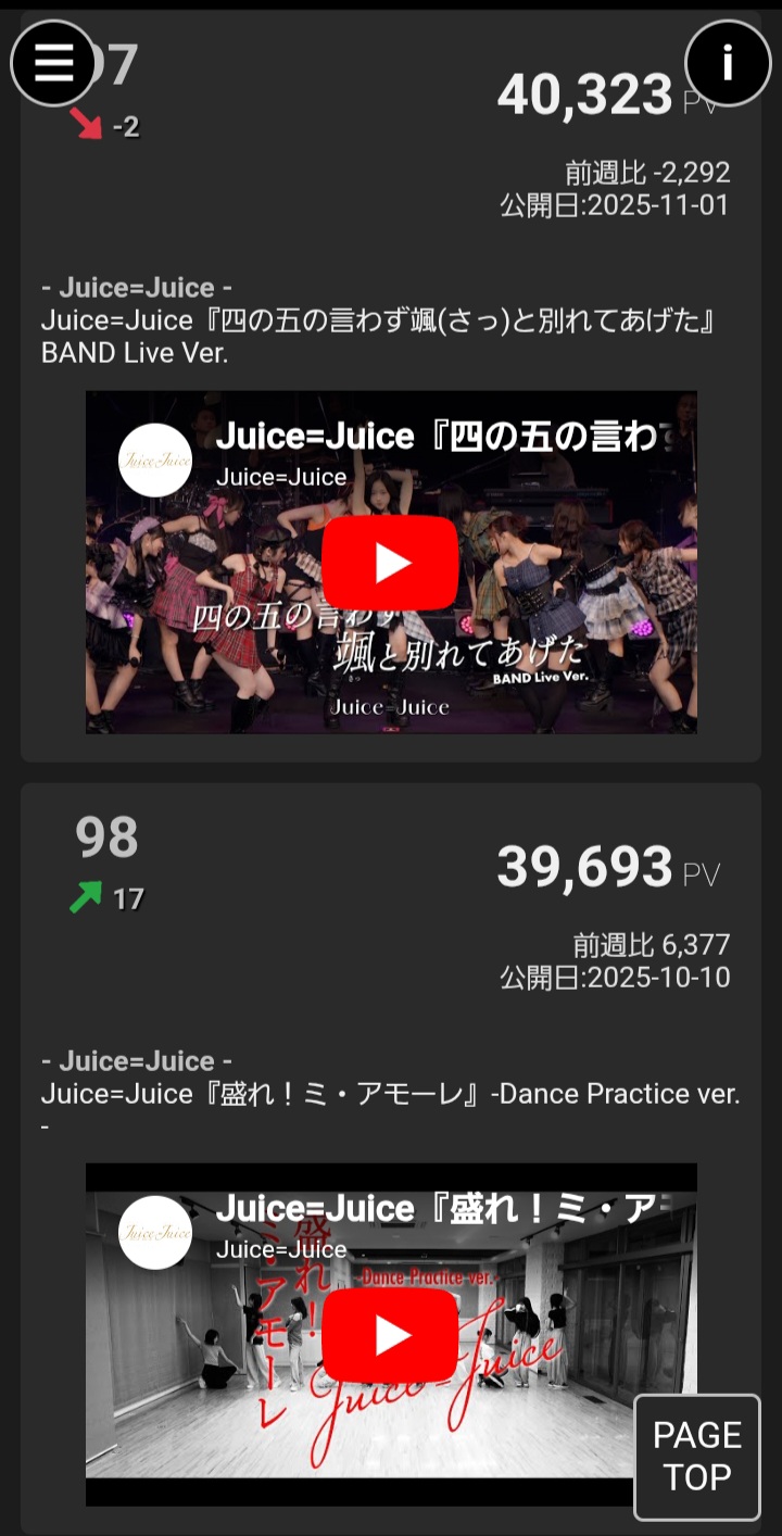 【速報】Juice=Juice「盛れ!ミ・アモーレ」MV再生回数が2025年の日本女性アイドル総合順位40位に浮上!週間再生回数は総合11位!