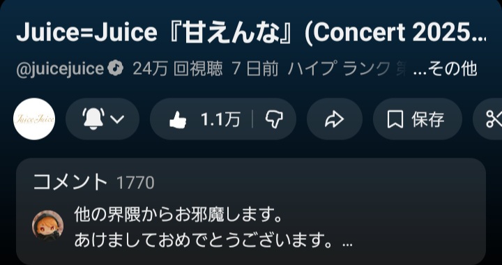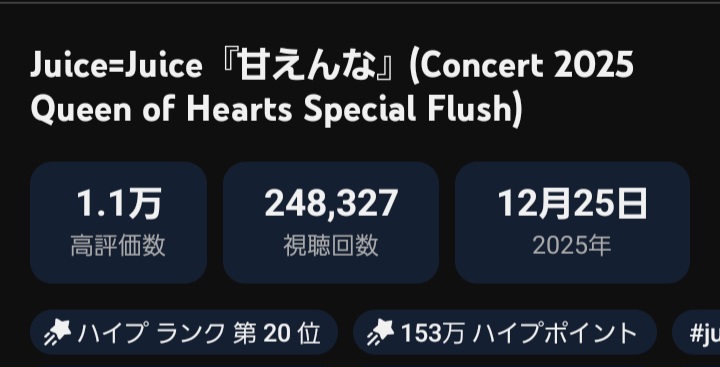 【速報】Juice=Juice新曲「甘えんな」日本武道館ライブ映像が1週間で24.8万再生!