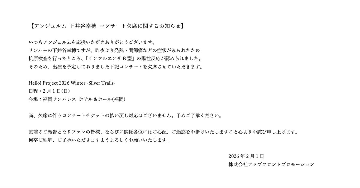 #アンジュルム 下井谷幸穂 コンサート欠席のお知らせ