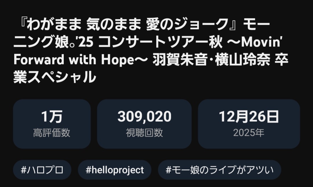 309,020再生/1.0万高評価/*,872コメント モーニング娘。’25「わがまま 気のまま 愛のジョーク」2025/12/26公開