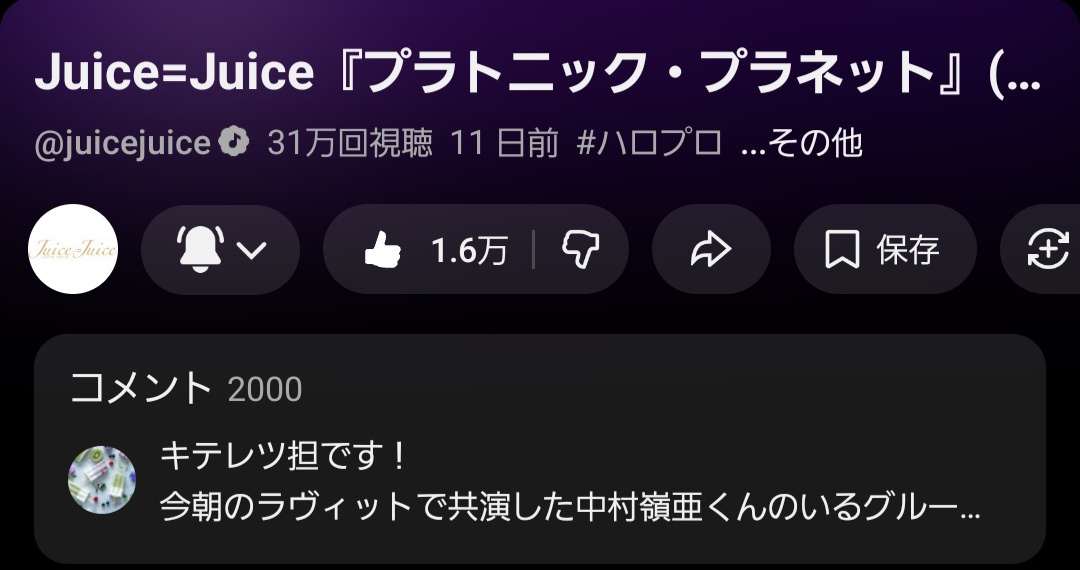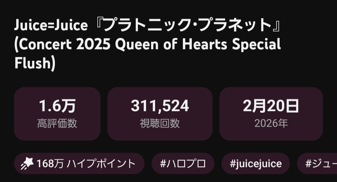 311,524再生/1.6万高評価/2,000コメント Juice=Juice「プラトニック・プラネット」2026/02/20公開