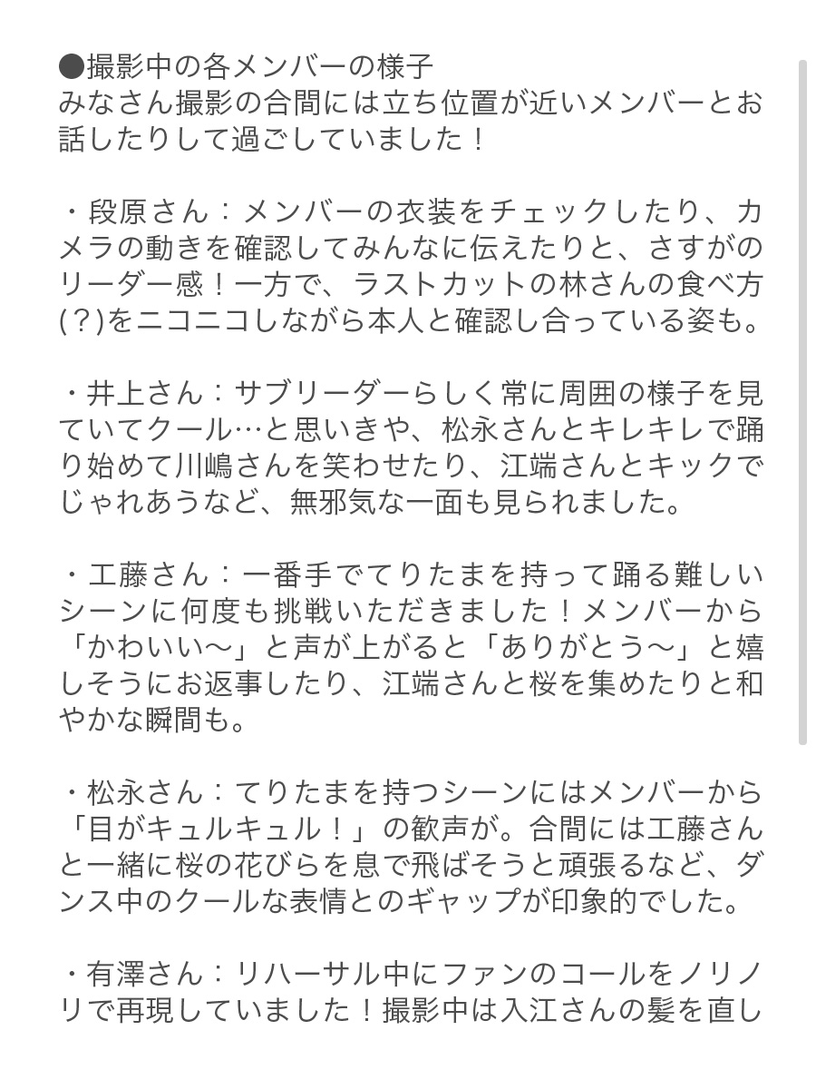 ・入江さん:何度も入念に振りの確認をしていてストイック!一方、片付けられていく桜の花びらをじーっと見つめたり、江端さん有澤さん工藤さんと花びらを拾い始める可愛らしい姿も目撃されました。
