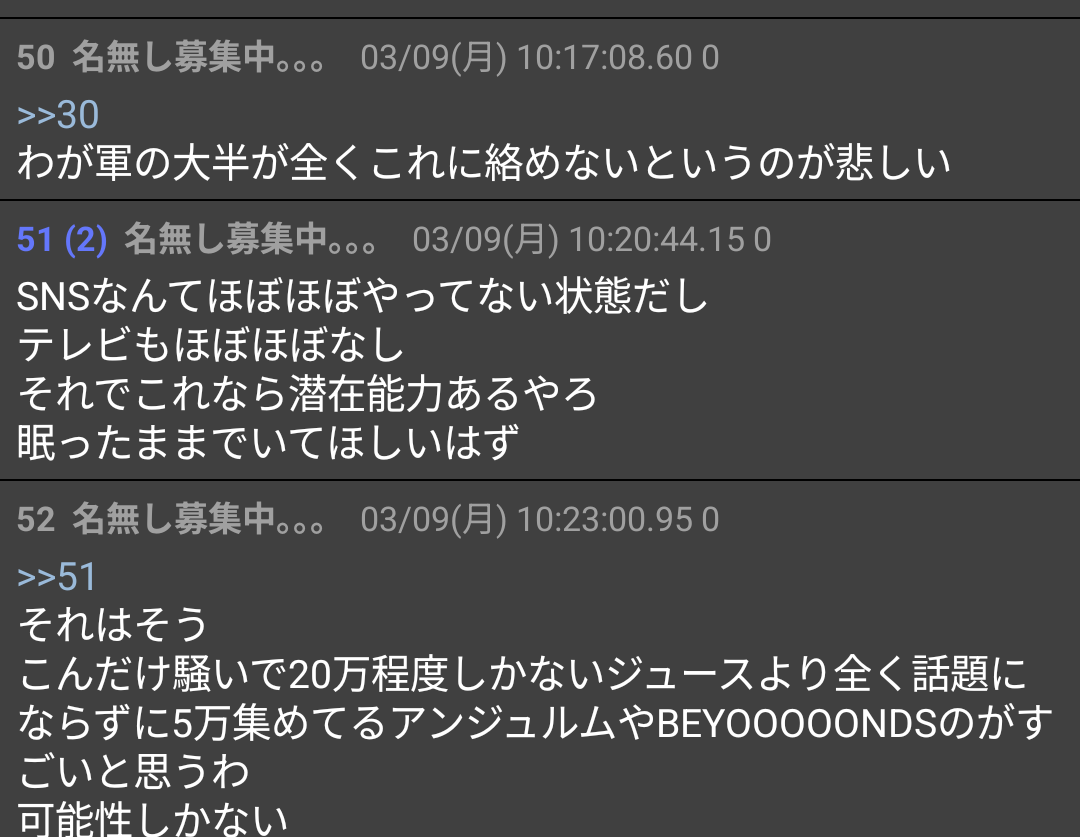 「アンジュやビヨはSNSをほぼやらずテレビにも出ずSpotifyで5万もリスナーがいるのはすごいし周りは潜在能力にビビっている」という声