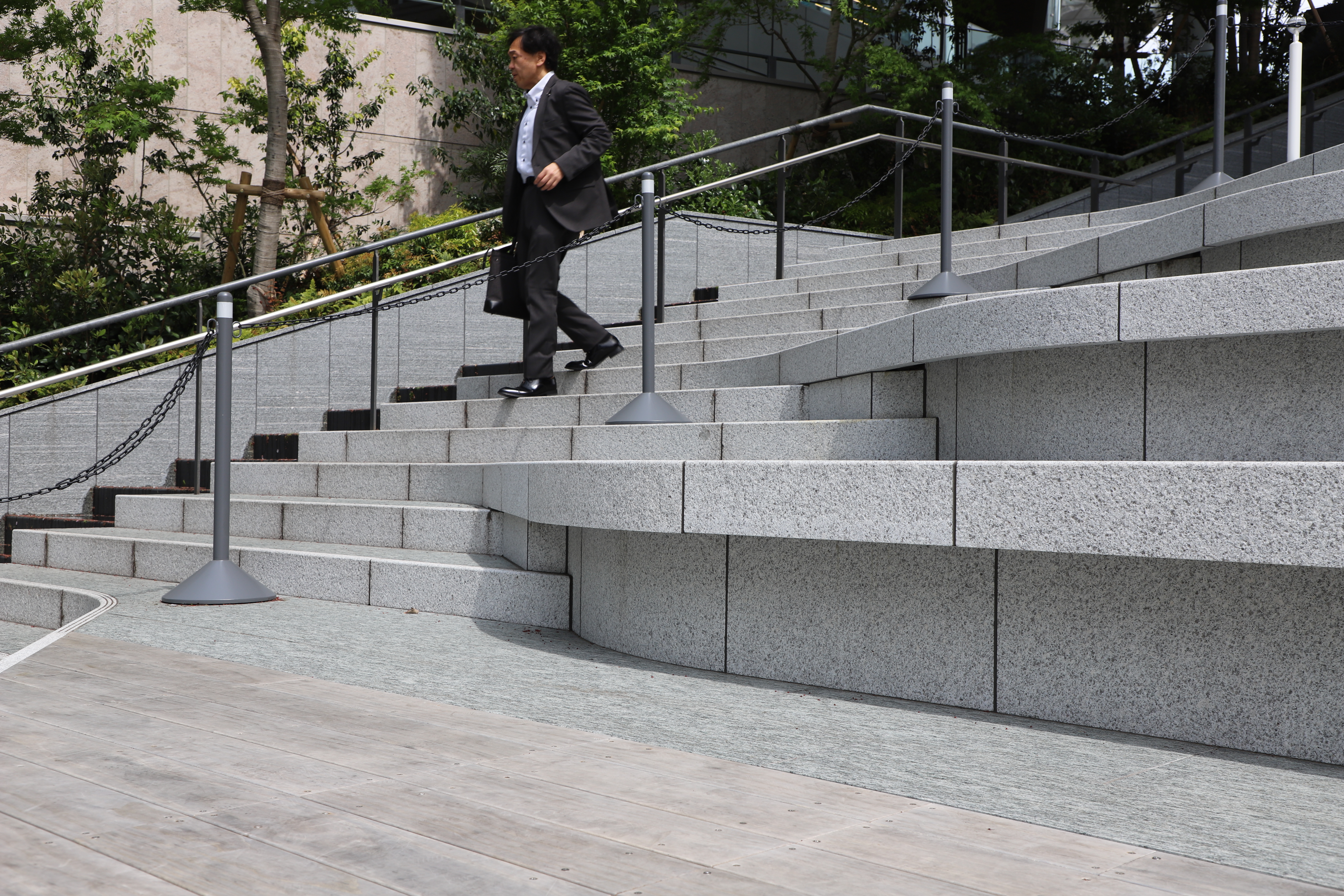 中央のベンチは、階段3段分の高さがあるにも関わらず、大階段の上部からは両サイドの階段との境界が見分けづらい。