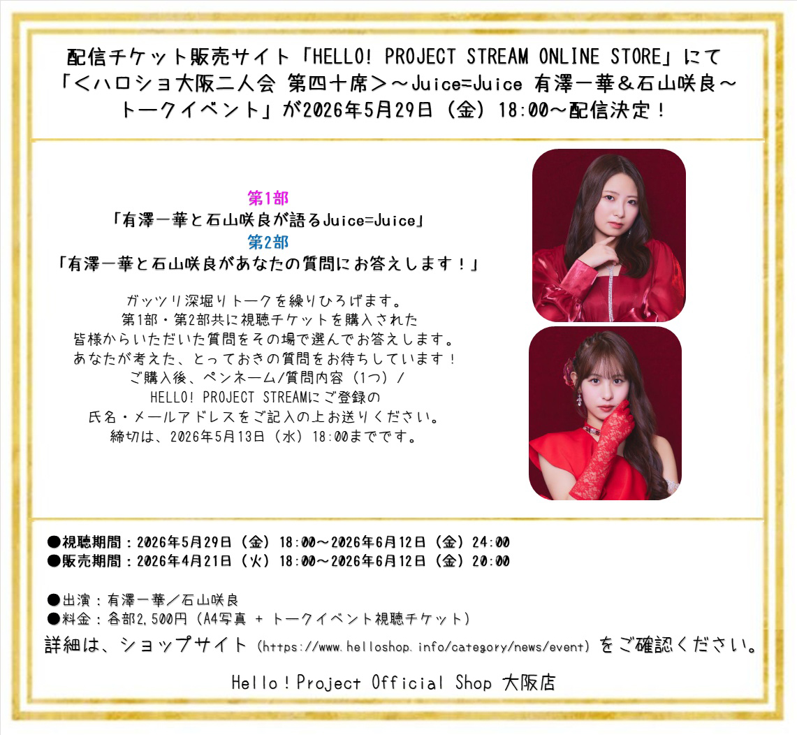 5/15(金)『<ハロショ大阪二人会 第四十席>~Juice=Juice #有澤一華 & #石山咲良 ~トークイベント』開催!