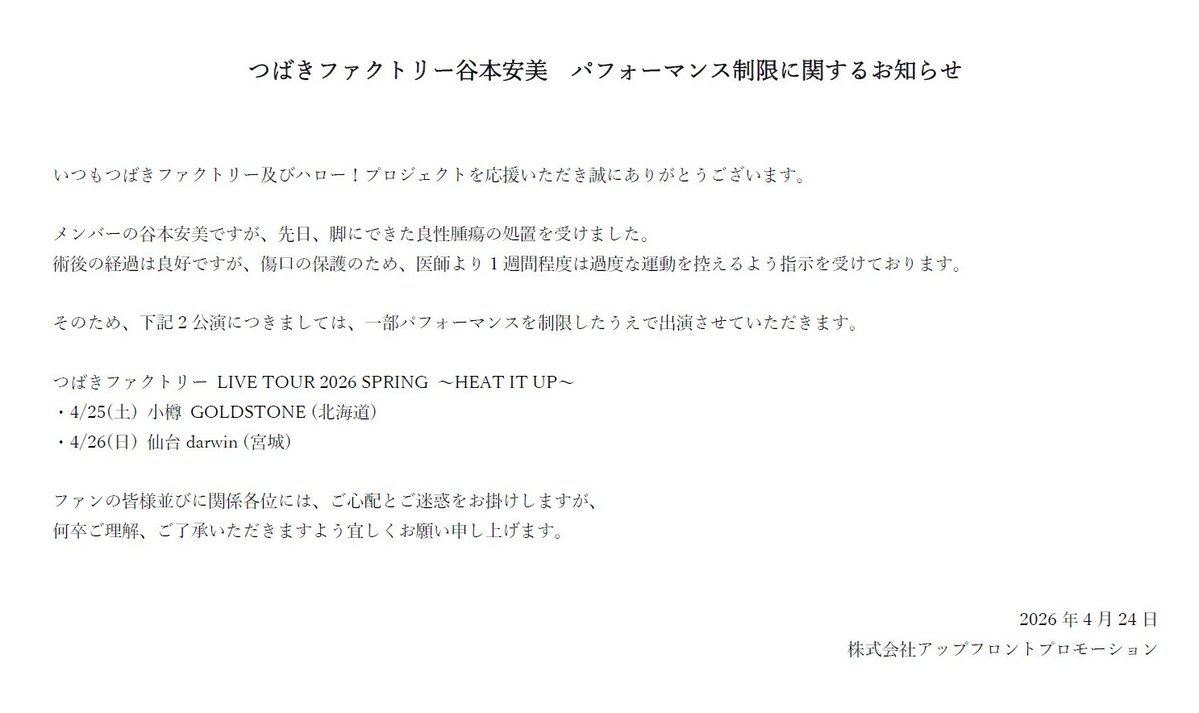 【つばきファクトリー谷本安美 パフォーマンス制限に関するお知らせ】